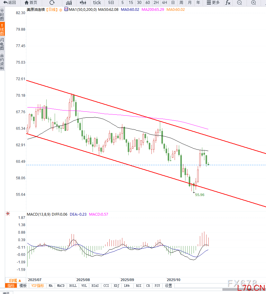 从技术面来看,WTI原油日线图显示价格已连续三日收阴,并跌破60.50美元关键支撑位,短期趋势转为弱势。MACD指标持续向下发散,显示空头动能增强;RSI维持在40附近,尚未进入超卖区,暗示油价仍有进一步下行空间。
