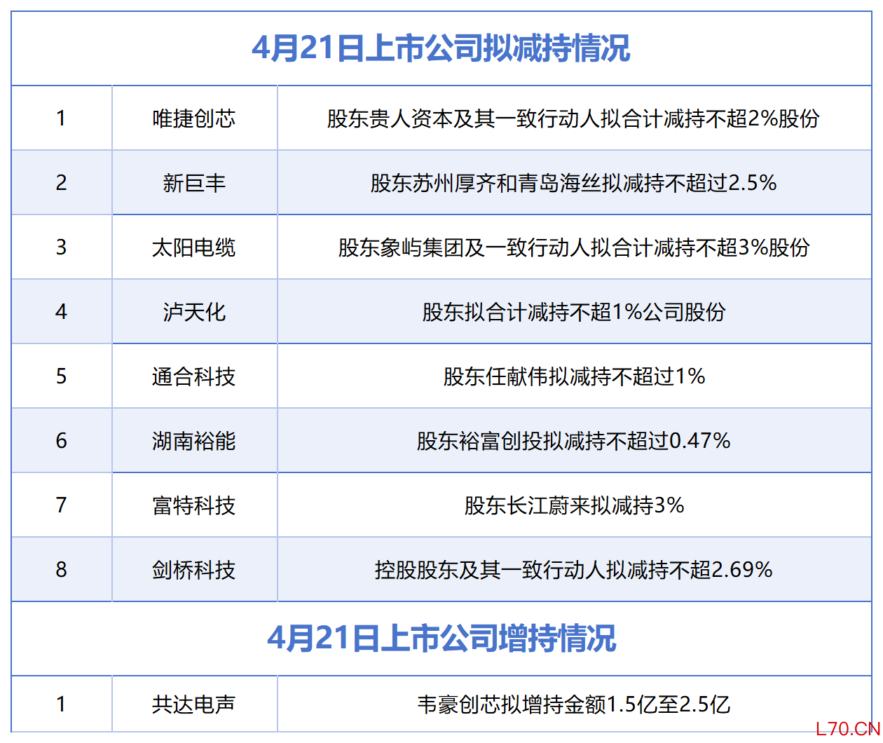 4月21日增减持汇总:唯捷创芯等8股拟减持,共达电声增持(表)